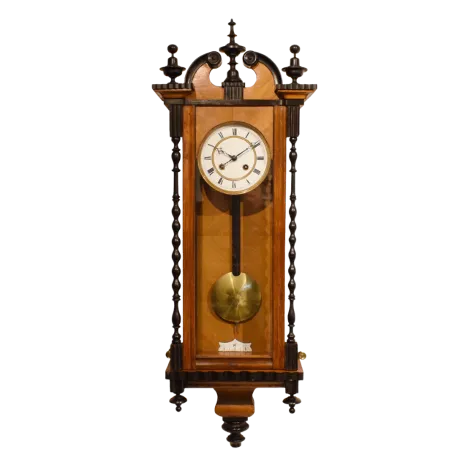 – Adjust the pendulum bob. Raise it to make the clock gain time, lower it to make it lose time. – Fine adjustments can be made using the regulator at the 12 position on the dial. Turn left to slow, right to speed up.